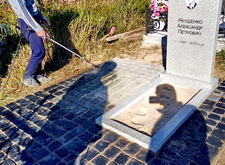 Замываем брусчатку и снимаем с надгробья защищающий надпись и фотокерамику скотч, протираем памятник от строительной пыли.